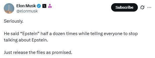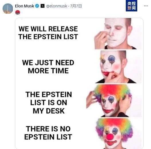 此外,在美国联邦调查局(FBI)和司法部于今年7月8日发布的调查结论后,马斯克也曾发布一张小丑形象的梗图,回应司法部对案件的处理态度,图中讽刺了美国政府在案件处理中的摇摆不定:“我们将公布爱泼斯坦案件名单→我们需要更多时间→名单就在我桌子上→爱泼斯坦无‘客户名单’”。